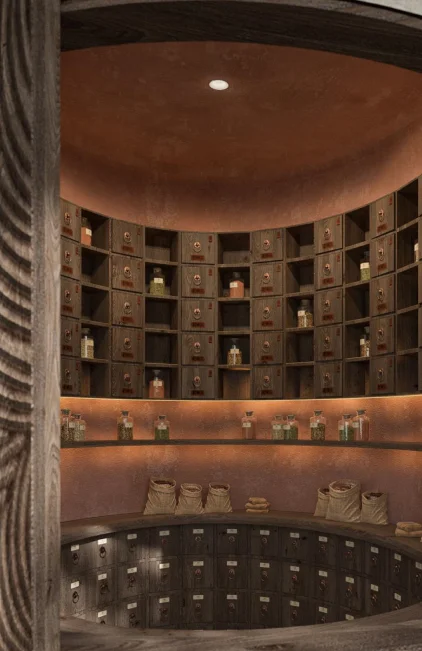 Beautiful circular kitchen with multiple storage boxes.