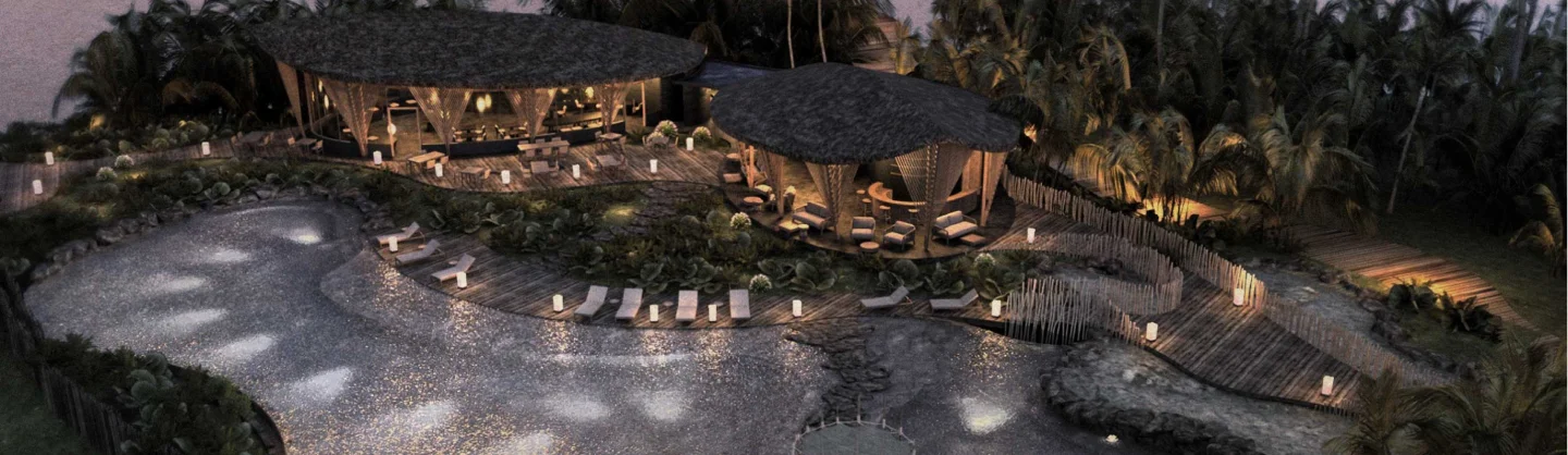 –  Pool with loungers, open-air lounge, river dining sala