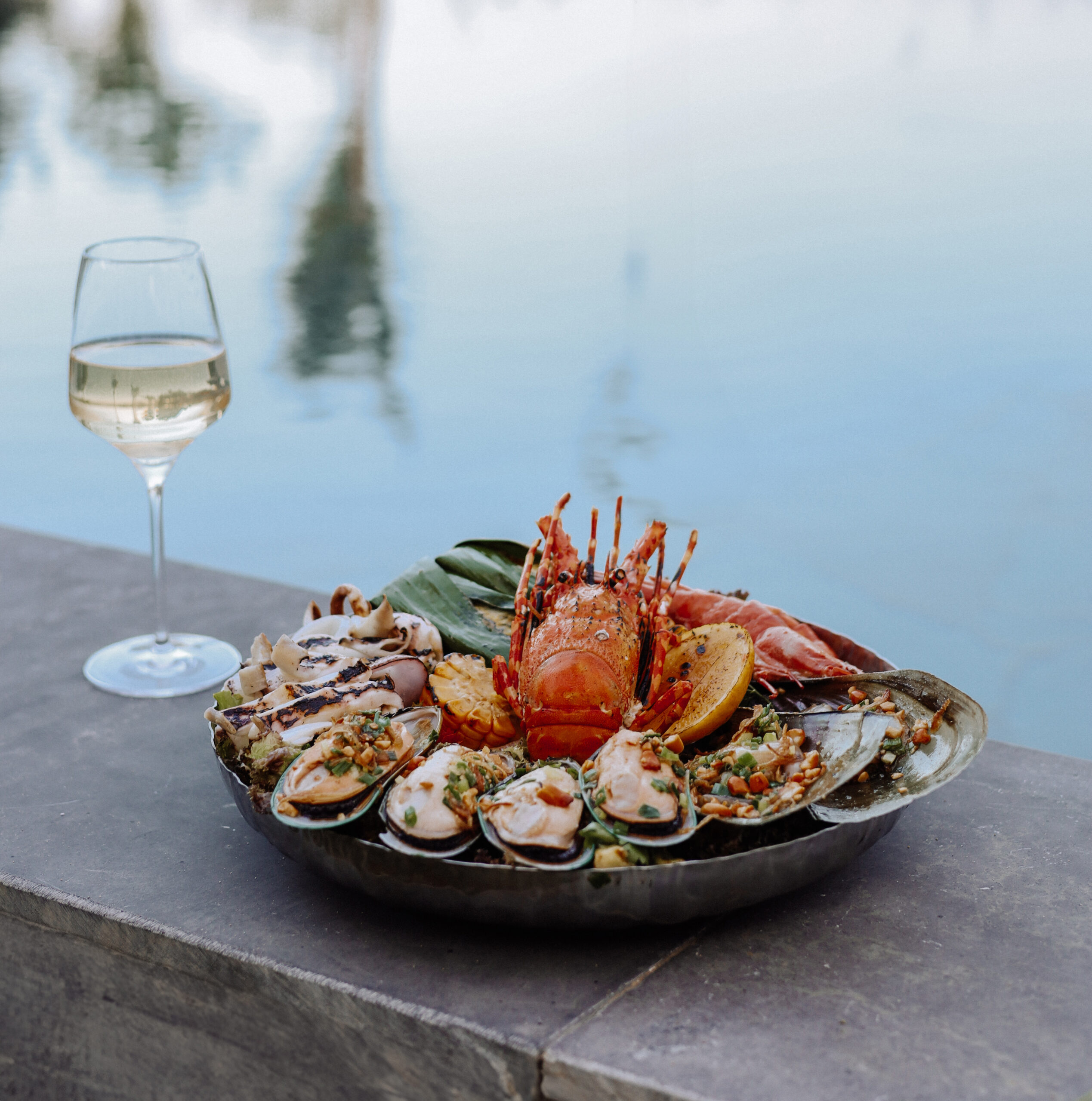 –  Pool with loungers, open-air lounge, river dining sala